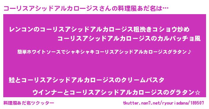 | 男性向けラノベタイトル風あだ名 | 『コーリスアシッドアルカロージスの嫁は女の子じゃないと思った?』 |
