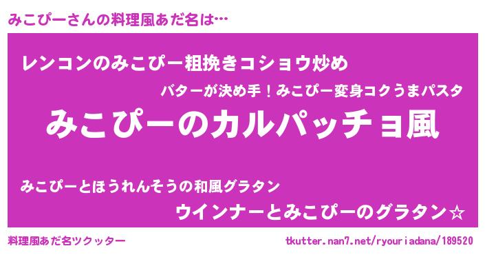 | ヒーロー風カッコイイあだ名 | 『仮面ミコダー』『ウルトラ戦士ミコピー』 |