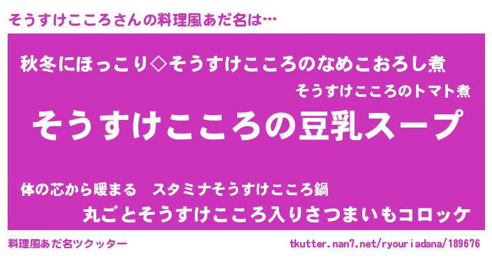 | 胡散臭い通販商品みたいなあだ名 | 『信頼と実績のサプリメント…その名も「そうすけこころ」』 |