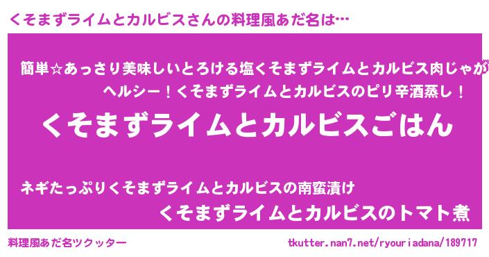 | 欧米人風あだ名 | 『トリンドルくそまずライムとカルビス』 |