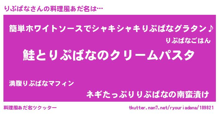 | 女子向けラノベタイトル風あだ名 | 『死神りぷばなの再婚』 |