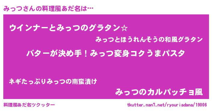 | 女子向けラノベタイトル風あだ名 | 『みっつ恋絵巻』『みっつ伯爵の花嫁』 |