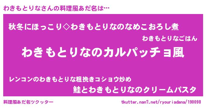 | 男性向けラノベタイトル風あだ名 | 『魔弾の王とわきもとりな』 |
