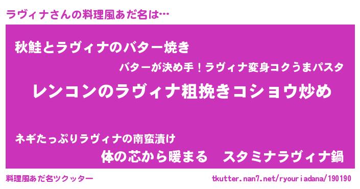 | ヘコむあだ名 | 『ラヴィナ(震え声)』『豆乳』 |