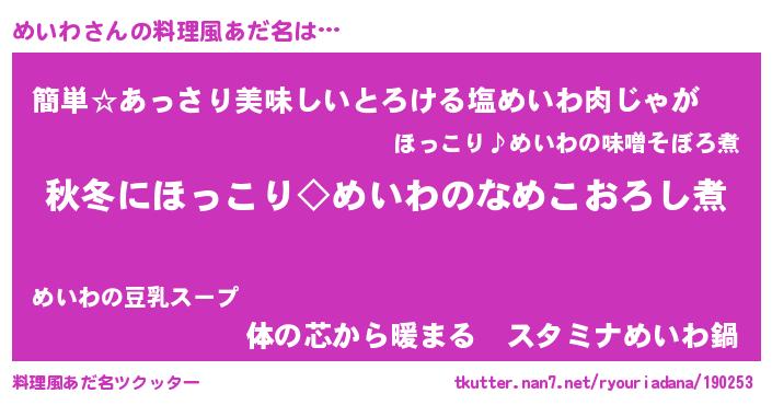 | ポケモン風あだ名 | 『メイゴンZ』『ゼニメイ』『ヒメイワ』 |