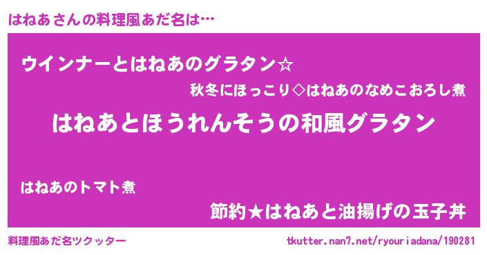 | 2回繰り返すあだ名 | 『わなわな』『ははねね』『はねはね』 |