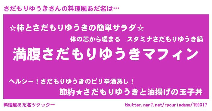 | 胡散臭い通販商品みたいなあだ名 | 『絶対に幸福をもたらす水素水…その名も「さだもりゆうき」』 |