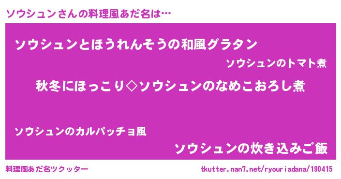 | 意味不明あだ名 | 『ニラ科ソウシュン属』『自称ソウシュン』 |