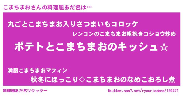 | 男性向けラノベタイトル風あだ名 | 『ダンジョンにこまちまおを求めるのは間違っているだろうか』 |