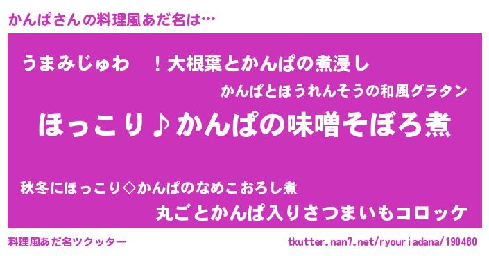 | 男性向けラノベタイトル風あだ名 | 『かんぱの憂鬱』『魔弾の王とかんぱ』 |