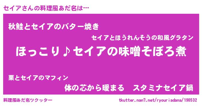 | 男性向けラノベタイトル風あだ名 | 『セイアの憂鬱』『はたらくセイアさま!』 |