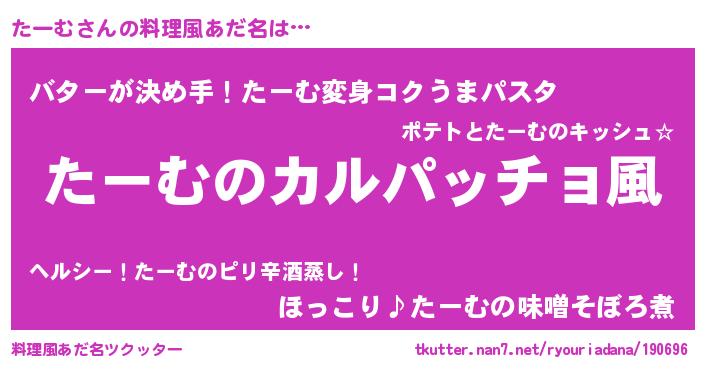 | 男性向けラノベタイトル風あだ名 | 『魔弾の王とたーむ』『たーむの憂鬱』 |