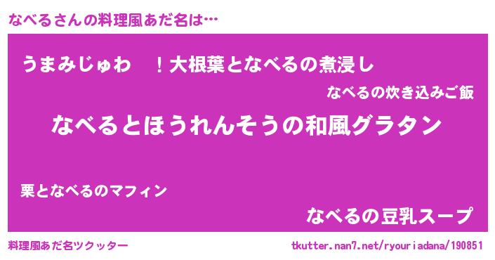 | 意味不明あだ名 | 『もやし科なべる属』『自称なべる』 |