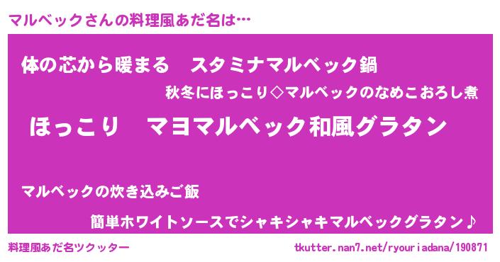 | 男性向けラノベタイトル風あだ名 | 『この素晴らしい世界にマルベックを!』 |