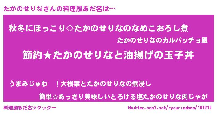 | ヘコむあだ名 | 『たかにゅー』『たかのせりな(苦笑)』 |