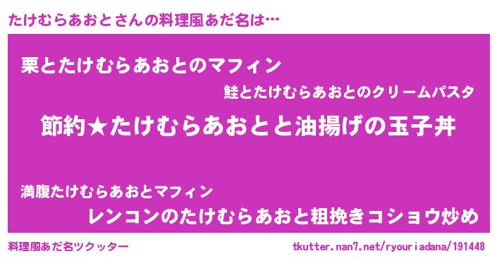 | ヘコむあだ名 | 『たけにー』『たけむらあおと(苦笑)』 |