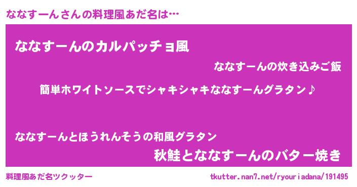 | 男性向けラノベタイトル風あだ名 | 『ななすーんの嫁は女の子じゃないと思った?』 |