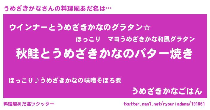 | 胡散臭い通販商品みたいなあだ名 | 『来世でも幸せになれる水素水…その名も「うめざきかな」』 |