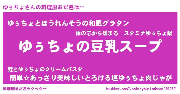| 胡散臭い通販商品みたいなあだ名 | 『信頼と実績のサプリメント…その名も「ゆぅちょ」』 |