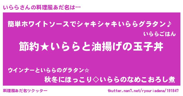 | 意味不明あだ名 | 『ペロリンいらら』『なめこ科いらら属』 |