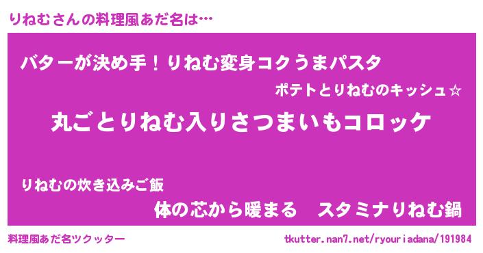 | 女子向けラノベタイトル風あだ名 | 『乙女ゲームの破滅フラグしかない悪役りねむに転生してしまった…』 |
