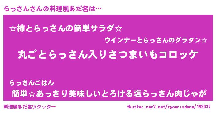 | 胡散臭い通販商品みたいなあだ名 | 『世界中を虜にした世界で10本だけ現存している希少なブランデー…その名も「らっさん」』 |