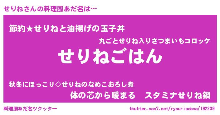| 意味不明あだ名 | 『しいたけ科せりね属』『ペロリンせりね』 |