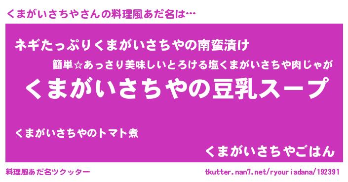 | 胡散臭い通販商品みたいなあだ名 | 『信頼と実績のサプリメント…その名も「くまがいさちや」』 |
