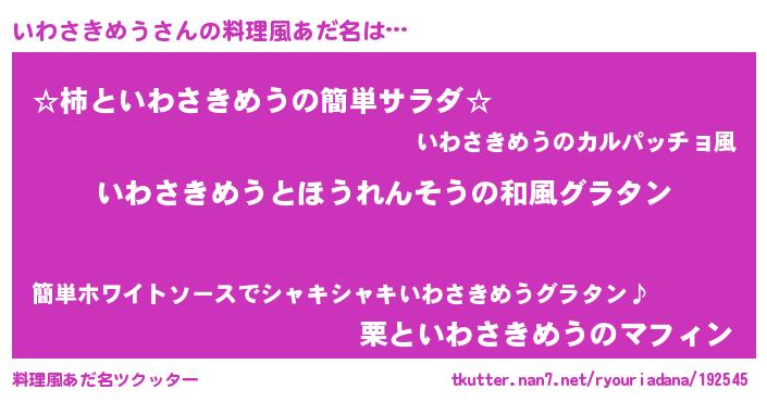 | 男性向けラノベタイトル風あだ名 | 『いわさきめう~年齢イコール彼女いない歴の魔法使い~』 |