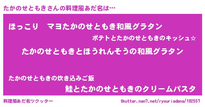 | 男性向けラノベタイトル風あだ名 | 『転生したらたかのせともきだった件』 |