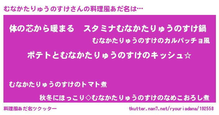 | 女子向けラノベタイトル風あだ名 | 『むなかたりゅうのすけの卵を拾いまして』 |