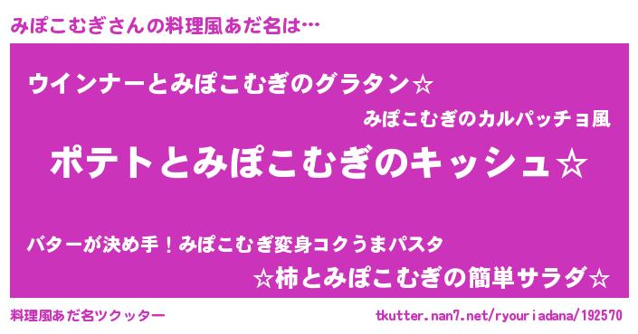 | 女子向けラノベタイトル風あだ名 | 『みぽこむぎの卵を拾いまして』 |