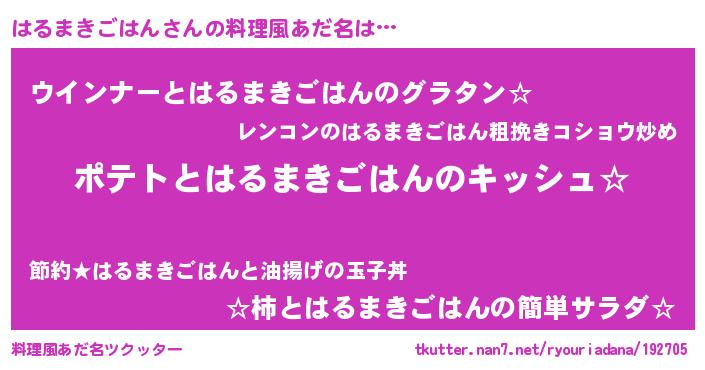 | 男性向けラノベタイトル風あだ名 | 『はるまきごはんの嫁は女の子じゃないと思った?』 |