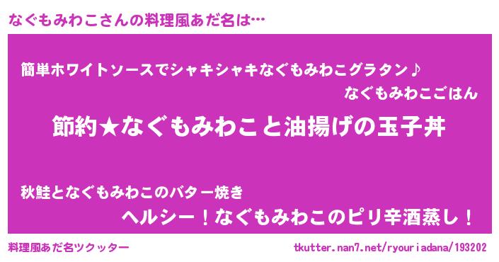 | 女子向けラノベタイトル風あだ名 | 『なぐもみわこ姫と円卓の騎士』 |