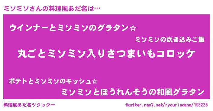 | ヒーロー風カッコイイあだ名 | 『仮面ミソダー』『ウルトラミソミソマン』 |