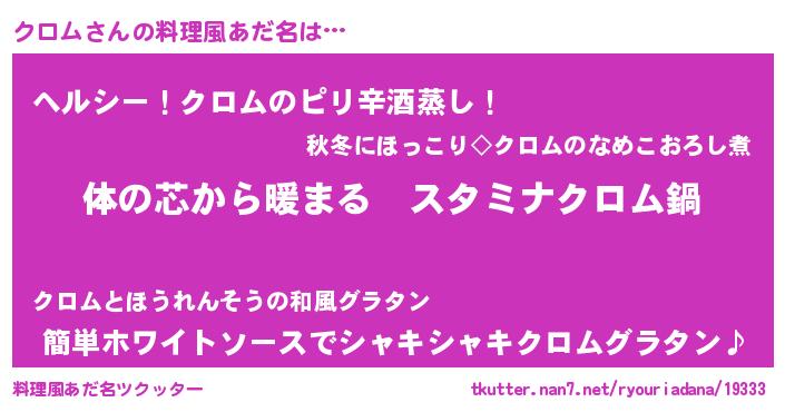 | 女子向けラノベタイトル風あだ名 | 『クロムの雑貨屋さん』『闇のクロム』 |