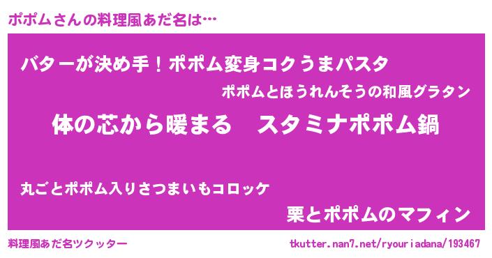 | 女子向けラノベタイトル風あだ名 | 『ポポムの雑貨屋さん』『ポポム恋絵巻』 |
