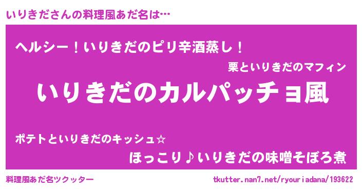 | 男性向けラノベタイトル風あだ名 | 『魔弾の王といりきだ』『いりきだの憂鬱』 |