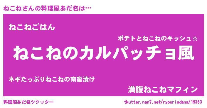 | 男性向けラノベタイトル風あだ名 | 『魔弾の王とねこね』『ネコネスレイヤー』 |