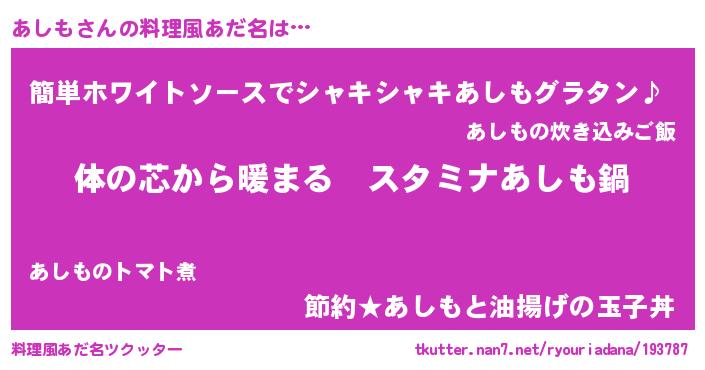 | 意味不明あだ名 | 『あしもフォーエバー』『ペロリンあしも』 |