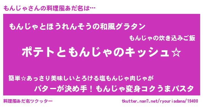 | 男性向けラノベタイトル風あだ名 | 『もんじゃの嫁は女の子じゃないと思った?』 |