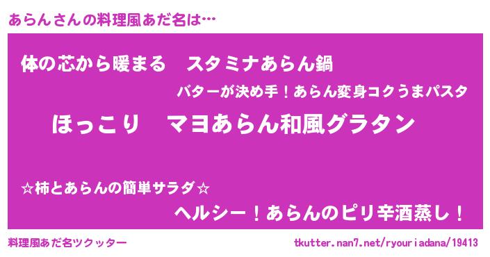 | 意味不明あだ名 | 『住所不定無職あらん(1歳)』『自称あらん』 |