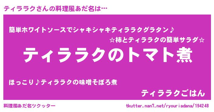 | 男性向けラノベタイトル風あだ名 | 『おまえをオタクにしてやるから、俺をティララクにしてくれ! 』 |