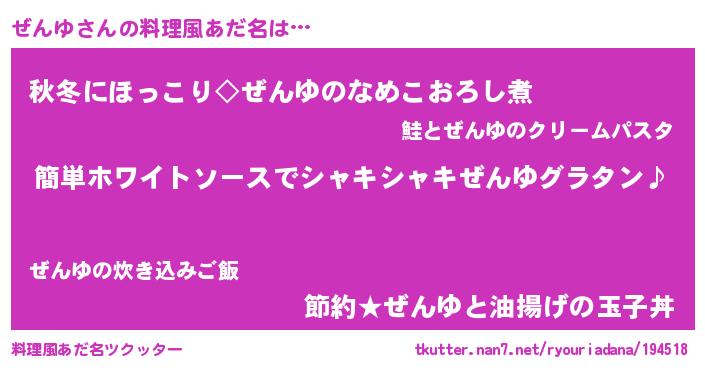 | 女子向けラノベタイトル風あだ名 | 『ぜんゆ様がみてる』『死神ぜんゆの再婚』 |