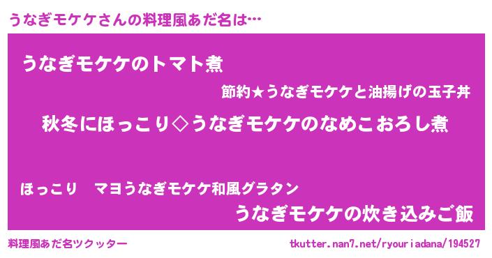 | 男性向けラノベタイトル風あだ名 | 『うなぎモケケに滅ぼされるだけの簡単なお仕事です』 |