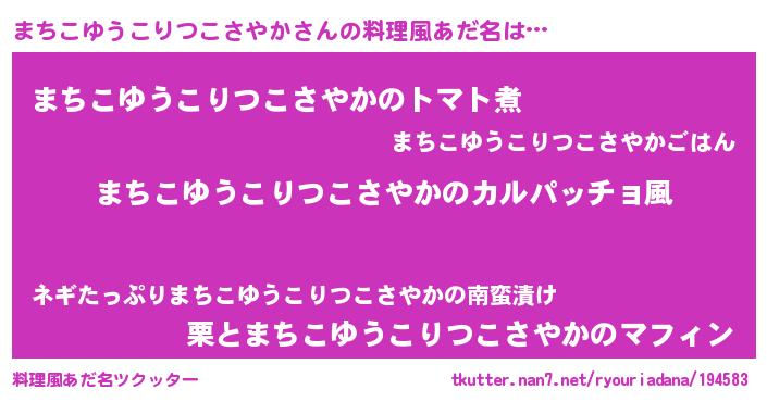 | 女子向けラノベタイトル風あだ名 | 『まちこゆうこりつこさやかが死なない童話 林檎のまちこゆうこりつこさやかの診療簿』 |