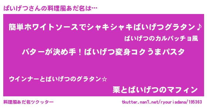 | ポケモン風あだ名 | 『バックウザ』『ヒバイゲツ』 |