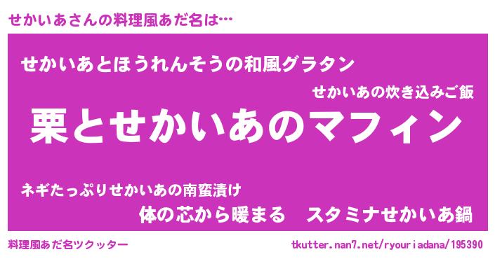 | ヒーロー風カッコイイあだ名 | 『ウルトラせかいあマン』『ネオセカイア』 |