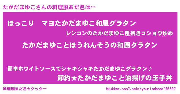 | 男性向けラノベタイトル風あだ名 | 『たかだまゆこ~年齢イコール彼女いない歴の魔法使い~』 |
