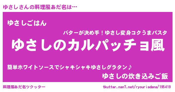 | 男性向けラノベタイトル風あだ名 | 『魔弾の王とゆさし』『ユサシスレイヤー』 |